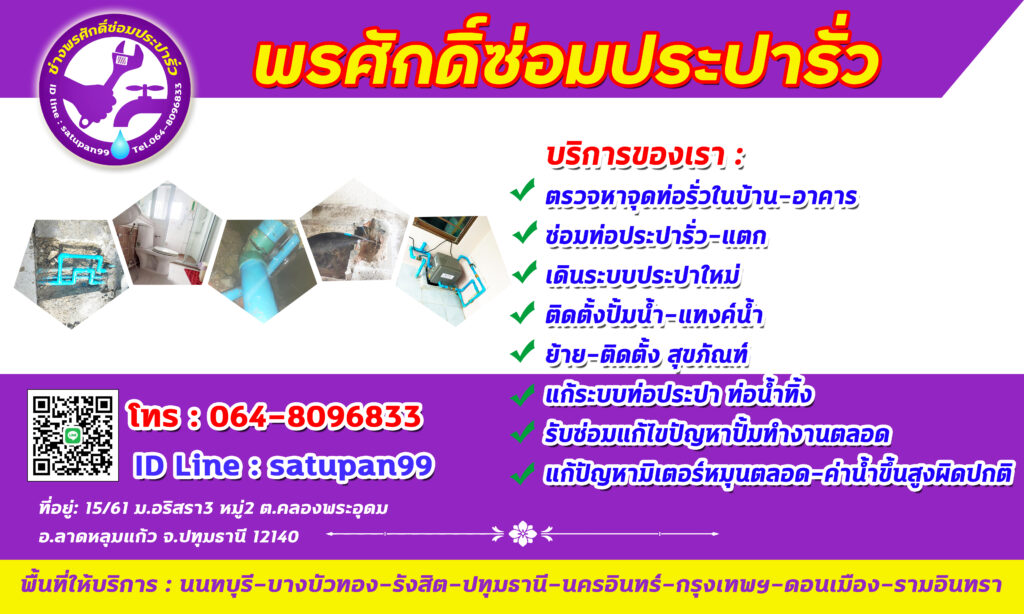 ยินดีให้คำปรึกษาและแนะนำวิธีแก้ไขปัญหาระบบน้ำประปา ช่างซ่อมท่อรั่วในพื้นบ้าน ผนัง ช่างตรวจหาท่อรั่วในบ้านซ่อมท่อรั่ว ช่างประปา-แก้ปั้มน้ำเดินถี่ ช่างแก้ปัญหาค่าน้ำสูงผิดปกติ ช่างแก้ปัญหามิเตอร์หมุนตลอด โดยไม่มีการใช้น้ำ โดยช่างประปามากประสบการณ์